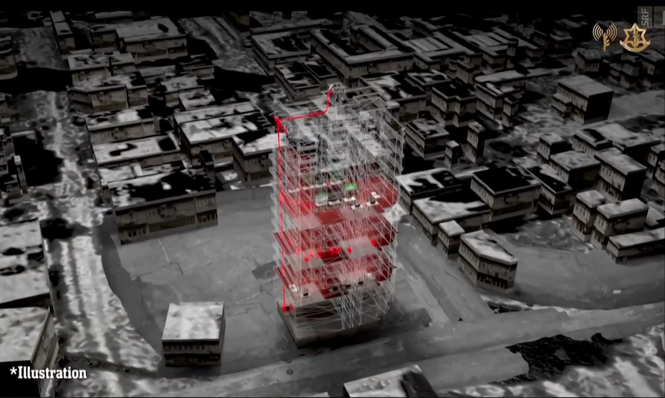 | Although such 3D videos are declared as 'illustrations', they appear to be exact reconstructions. They feign precision. This quickly makes them appear to be evidence. These videos about unproven Hamas infrastructure in hospitals and residential buildings have one purpose: to legitimise any war crimes committed by the IDF in the eyes of the international community. | Solche 3D-Videos sind zwar als ‹Illustration› deklariert, wirken aber wie exakte Rekonstruktionen. Sie täuschen Präzision vor. So wirken sie schnell als Beweis. Diese Videos über unbewiesene Hamas-Infrastrutkur in Spitälern und Wohnhäusern haben einen Zweck: Sie sollen allfällige kriegsverbrecherische Massnahmen der IDF vor der Weltöffentlichkeit legitimieren. |