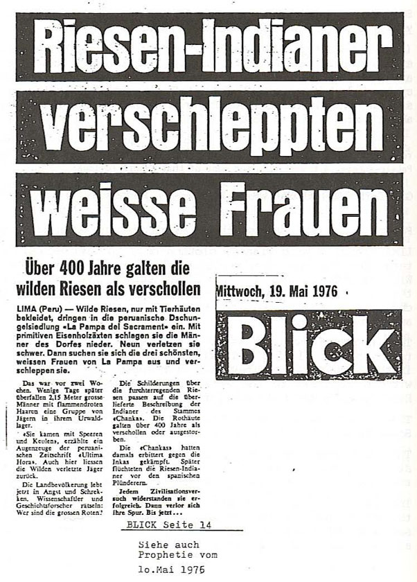 A newspaper clipping excerpt included in Wendelle Stevens book Message from the Pleiades. In German language, it is regarding the kidnapping of women by the so called "giants" in South America, as was chronicled in a prediction.[citation needed]