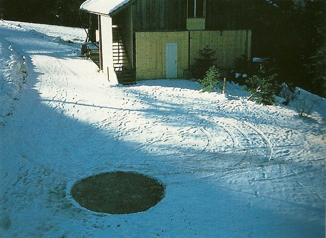 On each of the winter days of November 23, 1977 and February 21, 1978, one such track [left behind by a landing of Menara's ship] was laid directly in front of Billy's residence in Schmidrüti [see map, No. 19]. In this cold time of the year, the entire place was covered by a 10-12 centimeters (4-5 in.) thicklayer of ice. But as a result of the very hot gas flow that radiated from Menara's ship, the ice had melted at the landing site almost completely down to the ground. In this connection, there is something else worthy of mention. The track of November 23, 1977 was made during a lightning-fast visit from Menara. In fact, the visit took place within 10 minutes, the exact time it takes for Billy's wife, Kalliope, to take one of her children to the nearby school and return home. A skeptic would then have to figure out how it would be possible for Billy, a one-armed man, to melt such a large area of ice within 10 minutes in broad daylight without being seen by anyone.