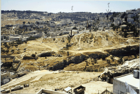 Hesemann believes he located the landslide/rubble ravine, within the Akeldama tombs region, which marks the approximate location. The photograph below (courtesy of Michael Hesemann, July 1998) indicates this area, with the probable site lying a little below the heavy arrowhead, with a question mark situated above at the top of the photo. The photo looks due south, and was shot from just outside the present south wall of the Old City. A second site of lesser probability lies some 50 yards to the right of the first, far underneath a thinner arrowhead and second question mark inserted at the top of the photo.